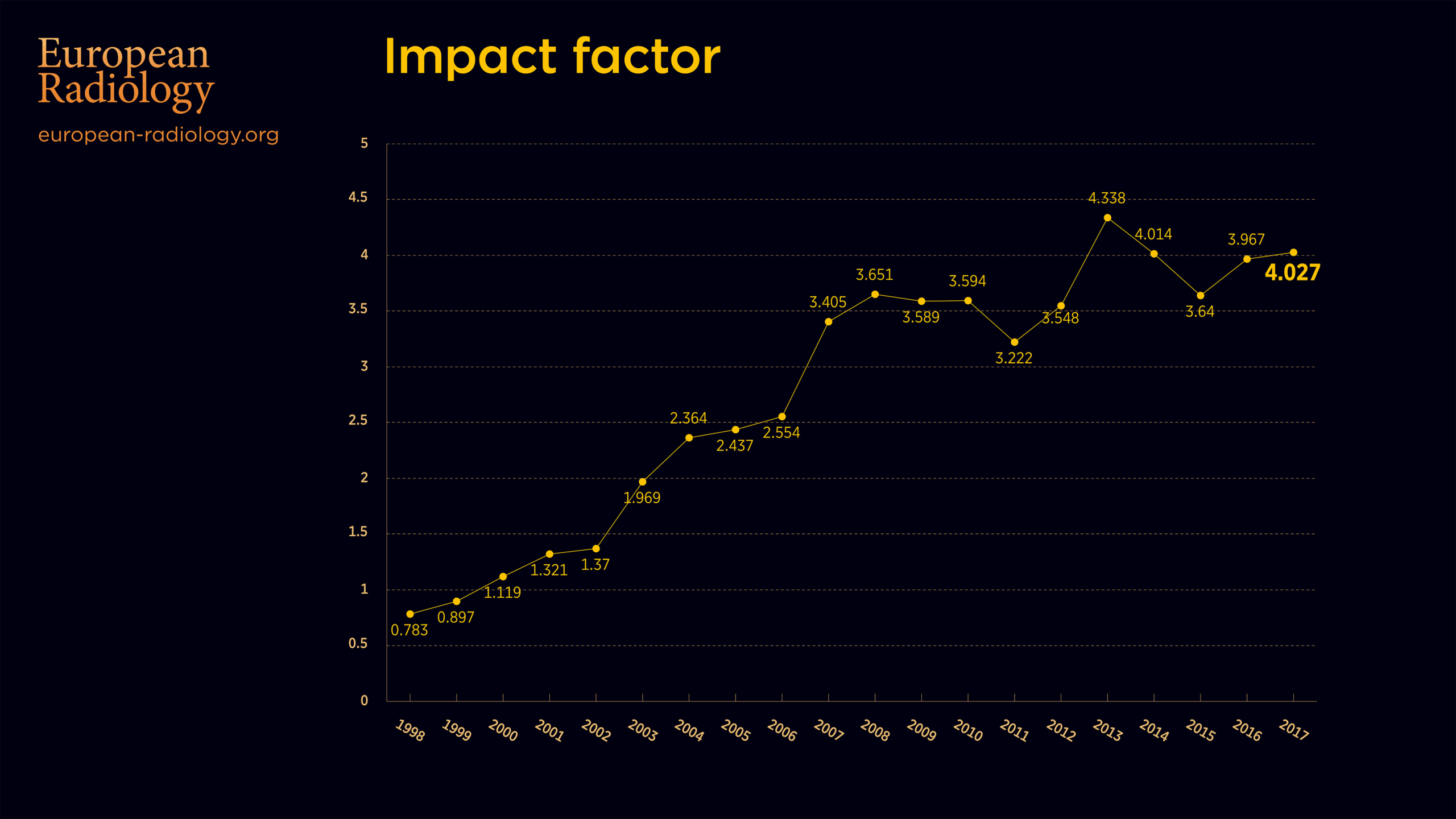 The current Editor-in-Chief, Prof. Yves Menu (Paris/FR), is thrilled with the news: “I am happy to see European Radiology’s newly released impact factor increasing again for 2017 to 4.027 from 3.967 in 2016. I would like to thank all authors and reviewers, and of course my predecessor Max Reiser, for their participation and instrumental input in raising the quality and attractiveness of our journal”.