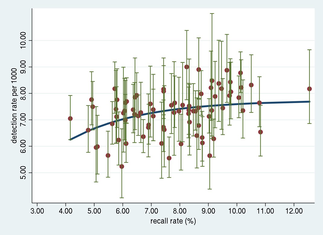 Our analysis of the data suggests two key findings. Firstly, that increasing the recall rate above 2.6% at prevalent screens and 4% at incident screens does not result in the detection of any more grade 3 invasive cancers. Crucially this suggests that the interval cancer rates from incident screens from grade 3 invasive cancers will be independent of the recall rate above 2.4%. This could be tested with a further analysis. Secondly, above about 4% at incident screens and 7% at prevalent screens the only appreciable increase in detection is in low/intermediate grade DCIS (all high grade DCIS being detected earlier). Again, this cold be subject to further evaluation. We have endeavoured to provide as much information as possible from this unique dataset used in the paper, however in response to your letter we have included an additional figure for prevalent screens (see below) showing 95% confidence limits around the cancer detection rate for each individual screening unit with the fitted model and this information can be considered along with Figure 1 in the paper. Note that the incident screen data is based on greater numbers of screens than the prevalent screens and the observed rates more statistically stable. The vast majority of confidence limits cross the fitted line and indeed the graph itself could have a QA use where a unit has 95% confidence limits that are wholly below the fitted line. We believe the models are a reasonable summary of the association between detection and recall rates. Further our conclusions that very high recall rates only increase the detection of non-invasive cancers are supported by comparisons between American and UK data as reported in the paper.