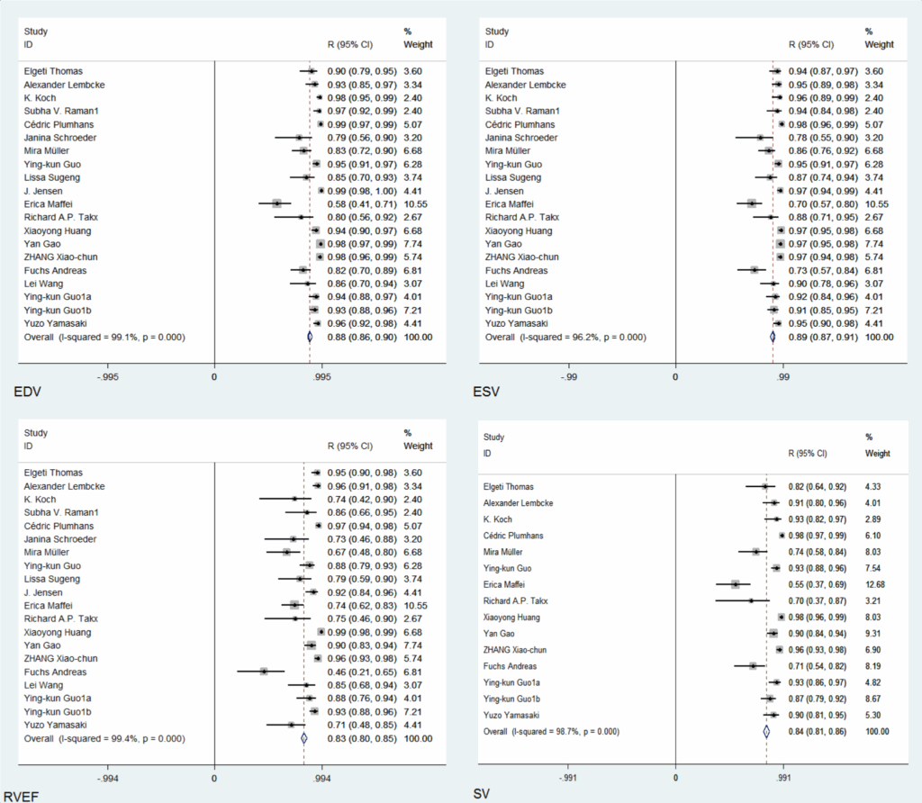 Fig. 5 Forest plots of correlation coefficient of EDV, ESV, RVEF and SV measured by CT and MRI in all included studies